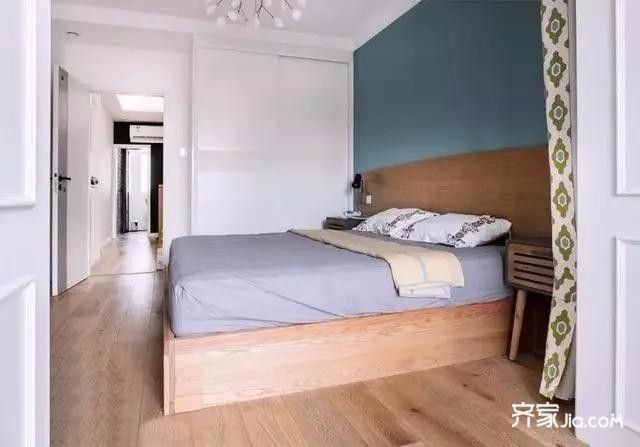 主卧里面,墨绿色的床头背景墙搭配紫色床品,有一种优雅清新的感觉,床头柜比较有特色,高教细腿显得很轻盈灵动,镂空的抽屉门可以让里面的物品通风散气,特别实用。倚靠墙壁定制了一个白色推拉门衣柜,节省空间,与整个墙面搭配起来十分协调