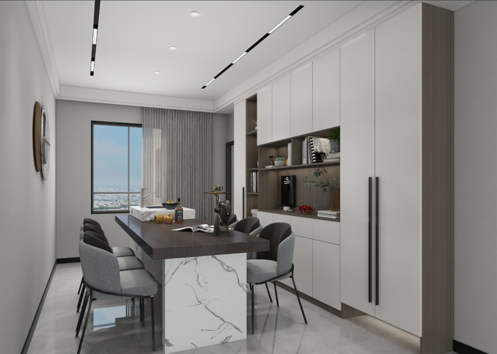 现代简约风,酒柜做成半开放,开放部位增加一组直饮机,石材台面高端大气