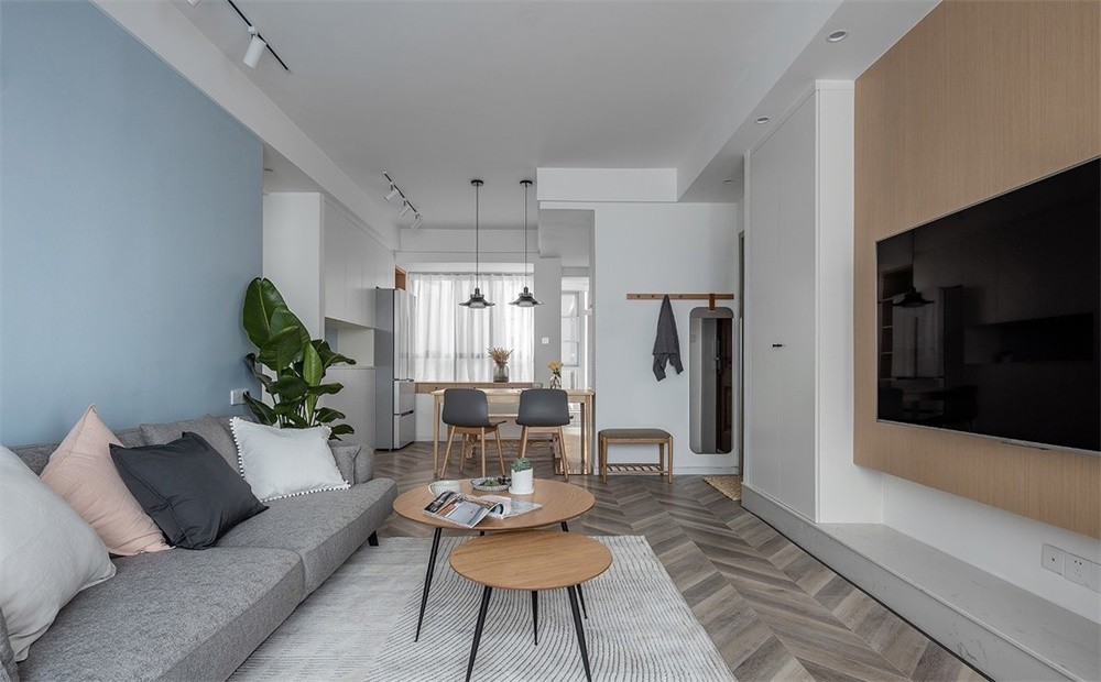 以电视为视觉中心的电视墙加以温润的科定面板饰面,通顶的鞋柜自然沉稳落在石材台面之上,无论是收口的3公分还是隐形灯带的处理,每一处细节设计都会令你我垂爱不已。