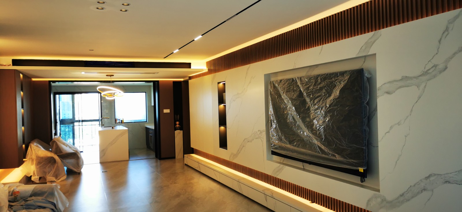 这是一套5房的房子.业主比较喜欢轻奢无主灯设计.改造之后房子的整体动线比较流畅.客厅大量使用了雪花白岩板.客厅地面铺贴了素雅肤感浅灰色地砖.背景墙与护墙板完美对接.筒灯使用了防炫筒灯.7米多长的地台延伸至餐厅.沙发背景墙使用了白色肤感护墙板.让整个客厅更有格调.厨房中间做了岛台.整个过道安装了护墙板.大门也用了柜体色整体效果特别好.衣帽间用的是铝框极窄边设计.玻璃用浅茶色更显***感,房间铺木地板.