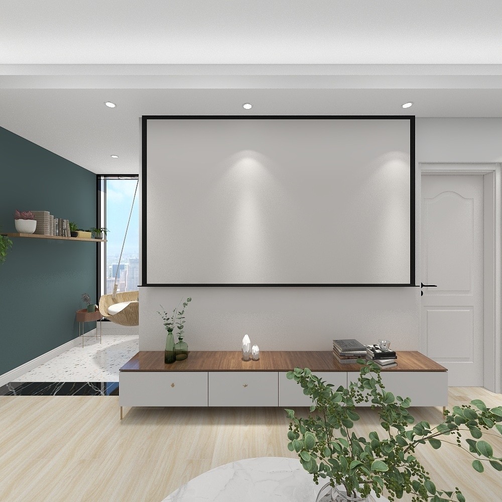 电视背景刷白漆,不做任何装饰和调色,,用幕布代替传统电视机,使空间更简约。