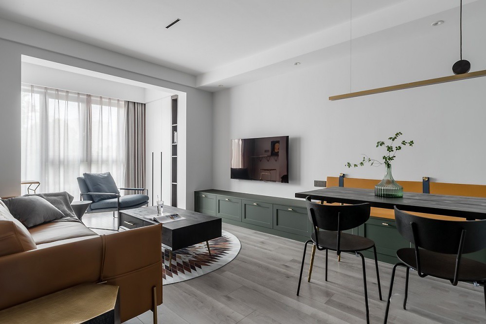 电视背景墙简约留白,使得空间感变得更大。餐厅与客厅同处一个空间,用餐区域的灰绿色卡座自然延伸至电视背景墙,简约统一且不会破坏连贯性。