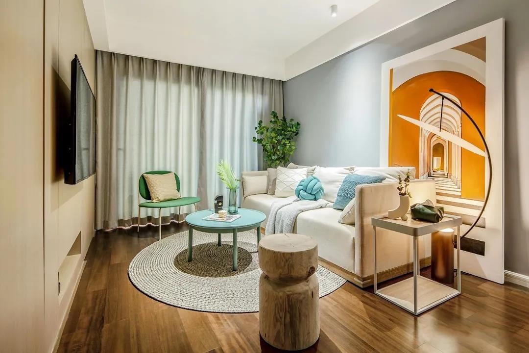 灰色地毯简约内敛,蓝绿色茶几在视觉上带来清爽的感受,二者搭配十分和谐,舒适感满分