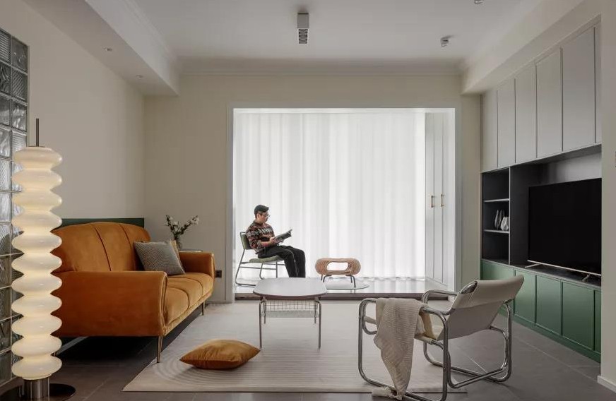 复古橙巧妙出现后,结合睡眠区的冷色调带来视觉上的冲击,创造出一个完整、立体的私密空间。