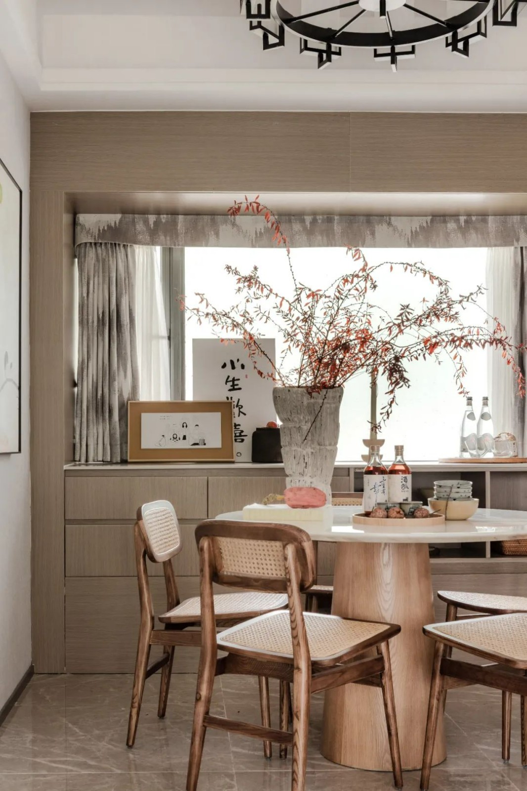 大理石与木饰面自然肌理纹路巧妙融合,构成层次丰富的写意空间。