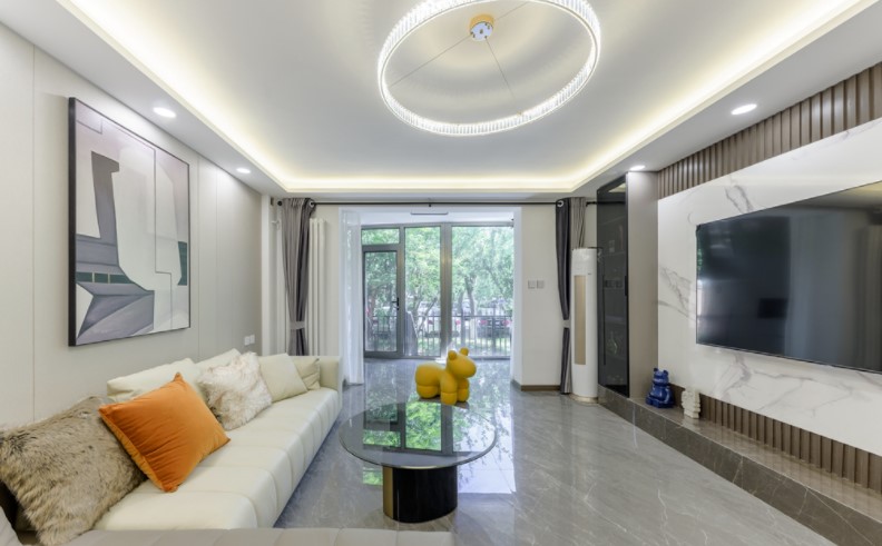 走过玄关门厅向右转,便能抵达客厅区域,整个空间采用白+灰+棕为主色调,塑造出典雅大气的质感。