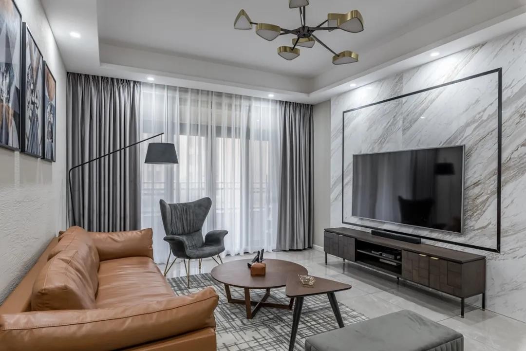 从窗帘到背景墙再到地毯的选色都是黑白灰色系,咖色的皮质沙发打破了灰色调营造的冰冷感,增添了温馨的居家氛围。