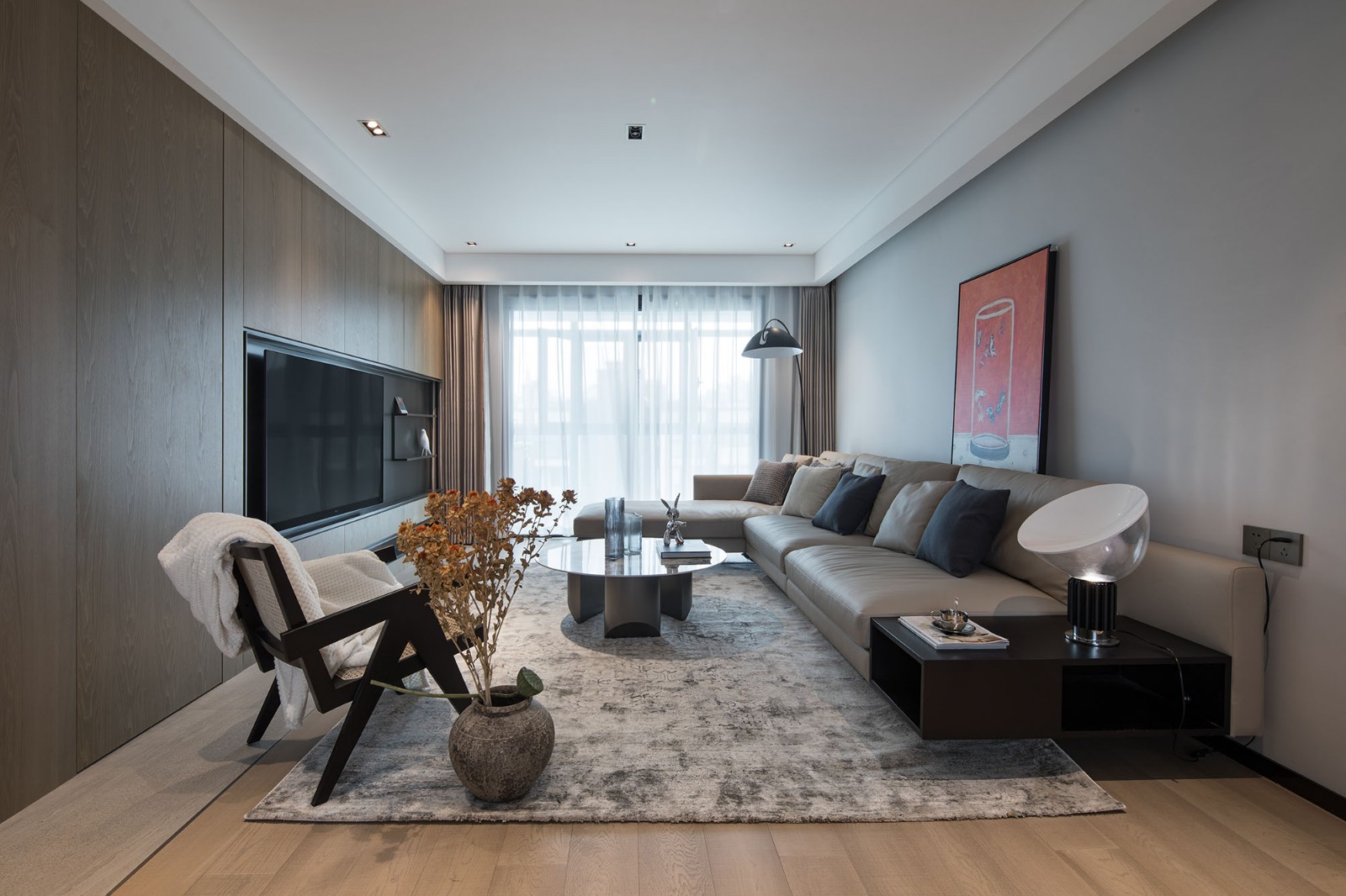 沙发墙灰色乳胶漆,色彩与木饰面呼应