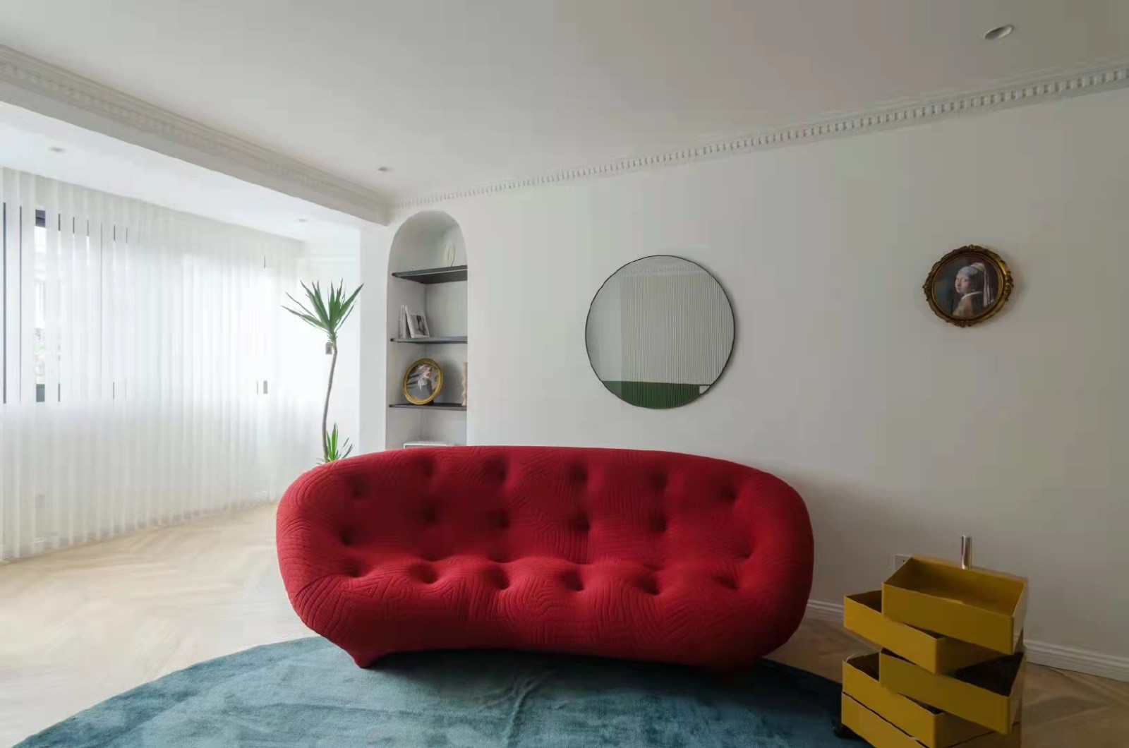 客厅墙面粉刷乳胶漆,红色沙发跳跃活泼