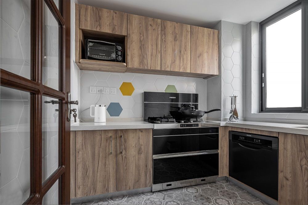 厨房墙面铺设浅灰色六角砖,点缀蓝色黄色与绿色,为空间增添了跳跃灵动感。与木质橱柜完美结合,简约自然中透露着精致感。