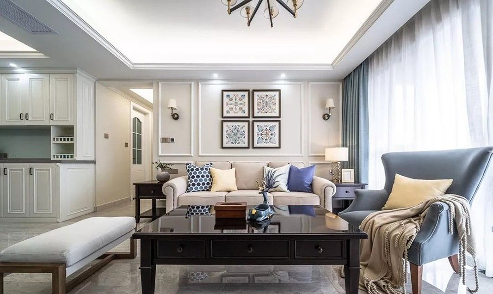 客厅简约的灰色沙发搭配原木茶几和电视柜,并运用各种花饰、丰富的木线变化来营造华美、富丽、浪漫的气氛;是美式风格常用的装饰手法。