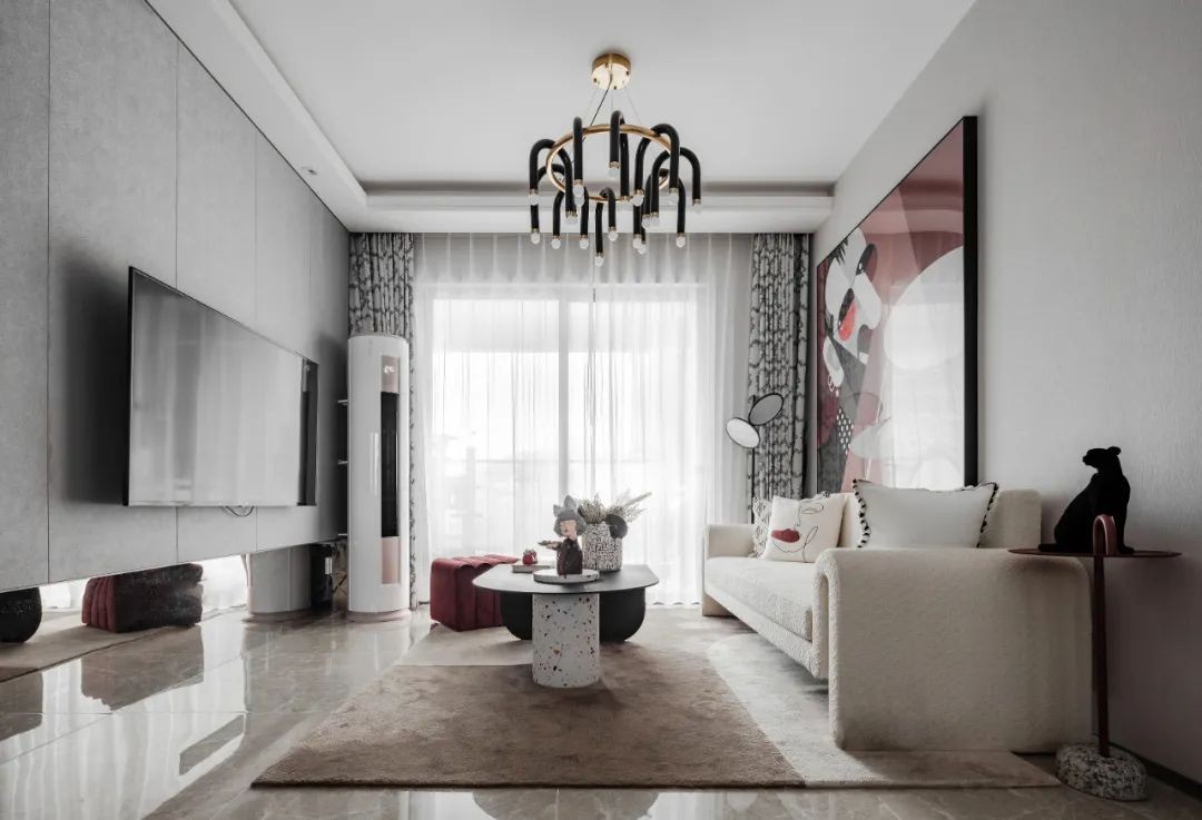 热烈而张扬的红是这个家的态度,那抹红裹挟着热烈情愫在柔和的空间中肆意流淌。艺术挂画、PUPU熊点亮空间的趣味性,赋予空间生活的热情。