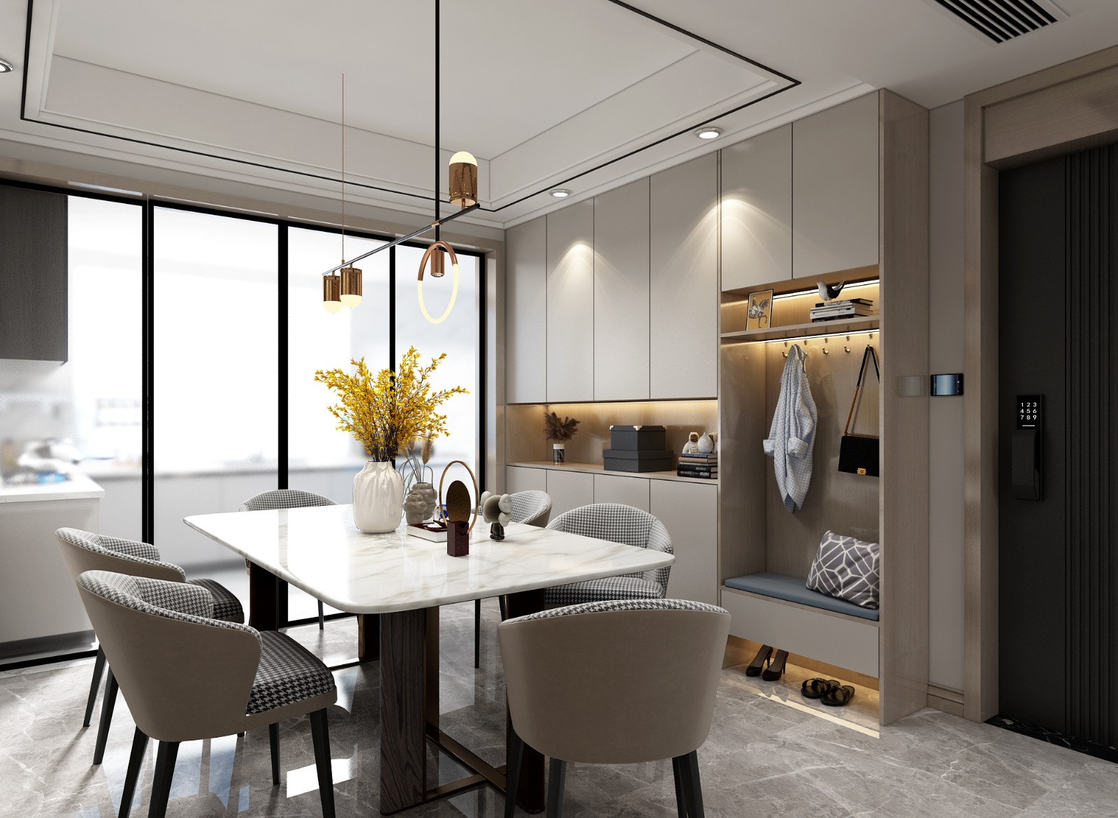 进门鞋柜设置换鞋凳,放置包包,钥匙的多功能格局