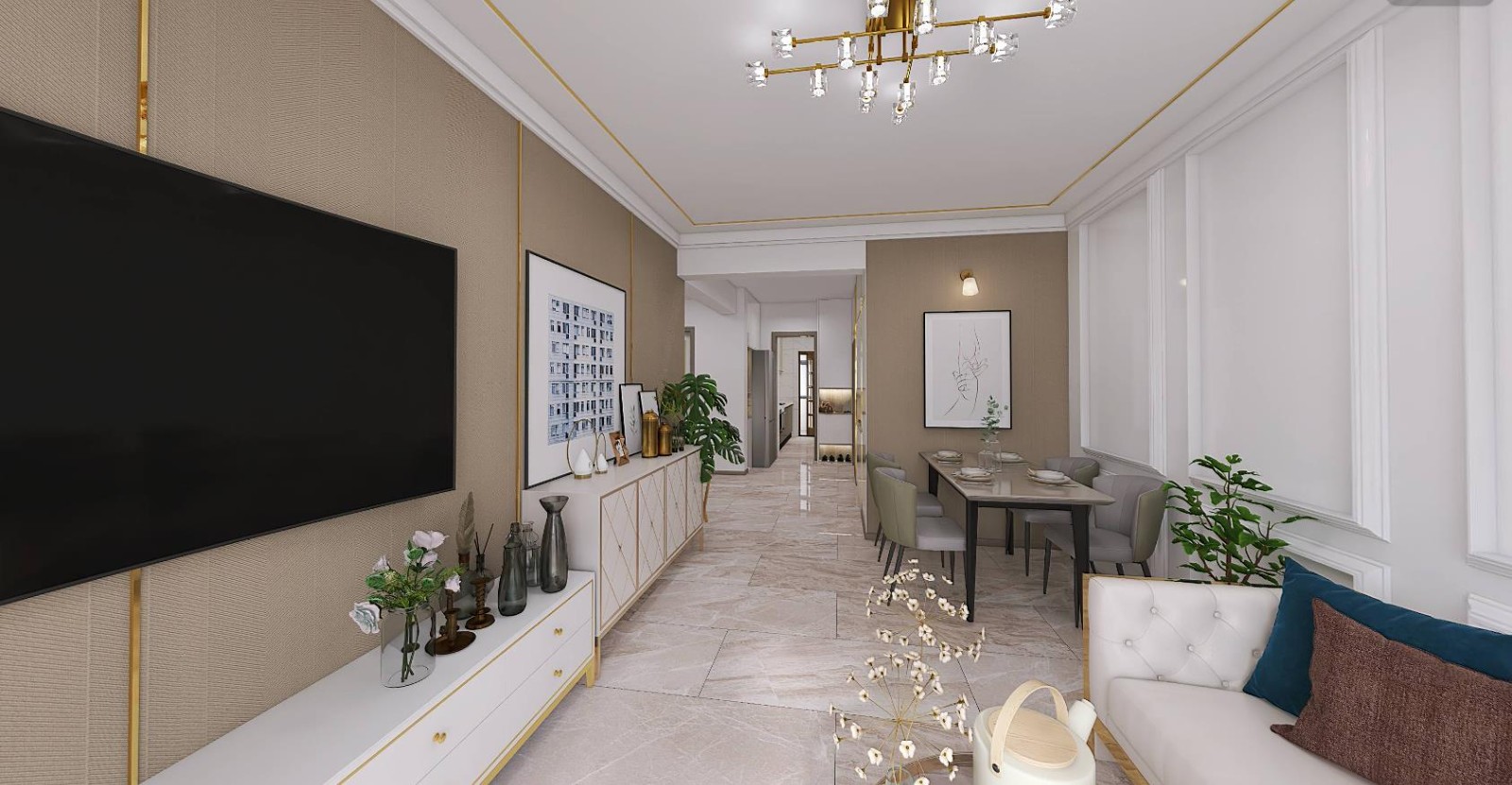 客厅吊顶使用平顶配合双侧石膏板线条 点缀金属线条 层次感突出