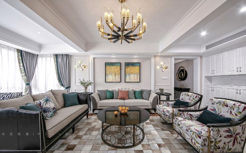 客厅韵味十足,色彩丰富浓淡相宜,且细节处理十分精致,墨绿色与绿植相互交融