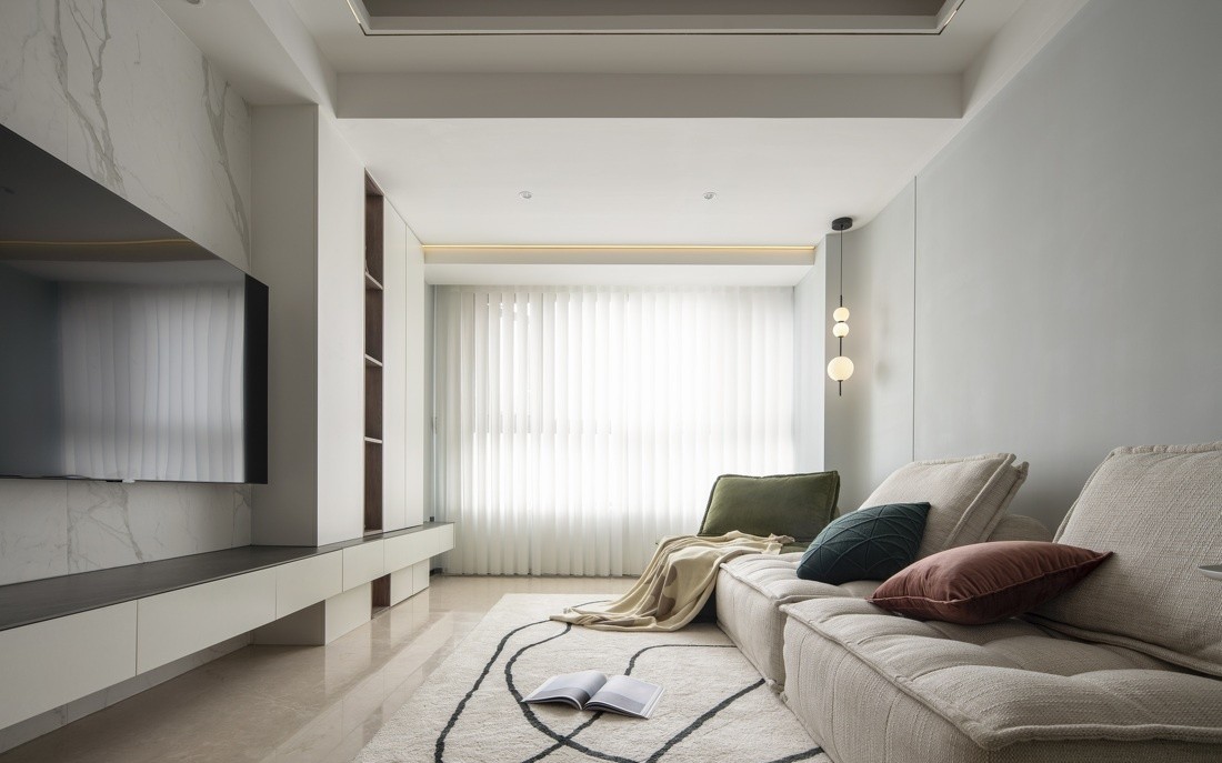 开间不大的休闲厅取消累赘的茶几,把日常收纳安置在墙边,柔软的地毯和舒适的沙发提供随时可卧可躺的慵懒惬意。