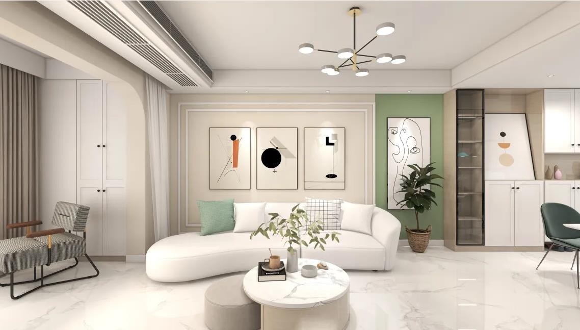 客厅北欧风主打简约,自然和人性化,客厅整体白色为主,墙用果绿色点缀