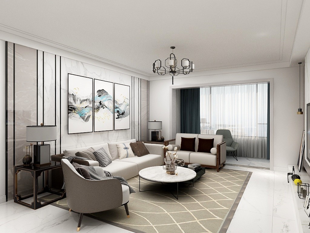 少许吊顶及石膏板装饰线装饰顶面,吊灯及筒灯配合照明达到室内无死角照明