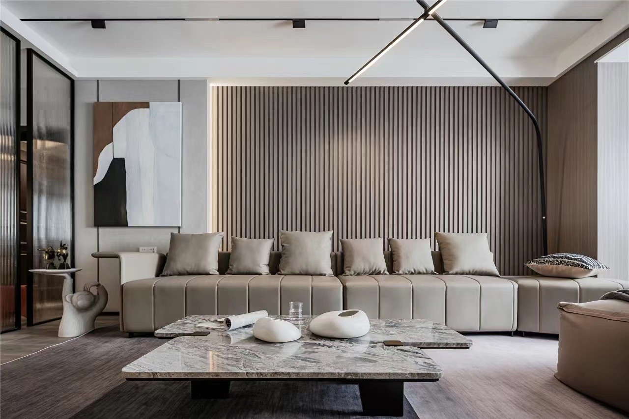 多人位的皮质沙发,满足日常待客需求,沙发后间隔十公分处,打造木格栅背景墙和隐形灯槽。(木格栅由师傅手工安装,沙发、电视背景墙加起来近100多根)