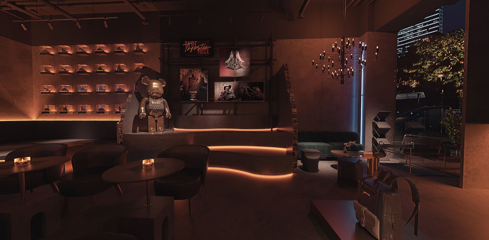 此户型较为方正,该设计方案会以一些潮流单品作为点缀,较多的打卡点去作为消费者打卡拍照的地点,整体的颜色色调偏向于深色调,用暖色的灯光烘托氛围感。