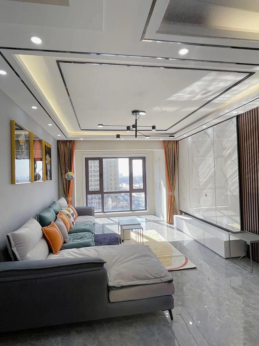 客厅把阳台打通之后宽敞了不少,中间没有做任何隔断,十分通透,活动范围也更加充足,家里是小户型的朋友也可参考这样设计,地面瓷砖并没有因为是灰色而显得暗淡,在光线的笼罩下反而很大气亮堂,相当耐看,吊顶加入了黑色线条点缀,丰富了空间的层次感。