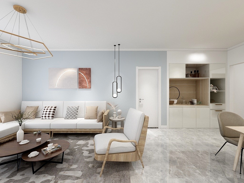 北欧风客厅喜欢用一些灰蓝色、浅蓝色、淡绿色、淡粉色等颜色来刷墙面,这些颜色比大白墙可要好看多了。这些颜色让白墙有了生气和活力,本案例就使用了浅蓝色墙漆沙发背景墙