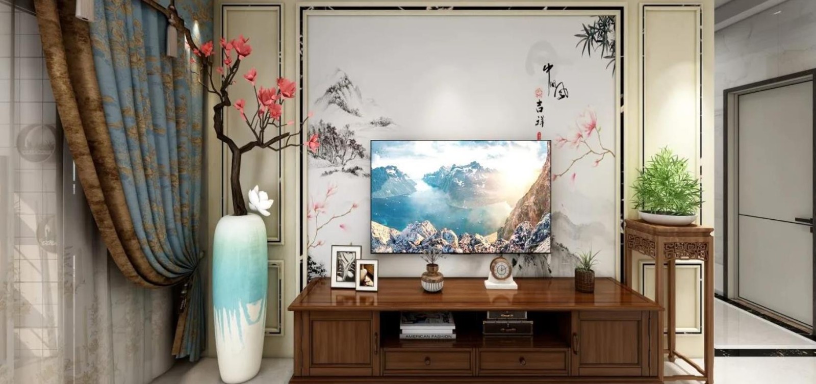 纯中式风格客厅,纯木桌子和青色花瓶点缀为屋子带来春的生机