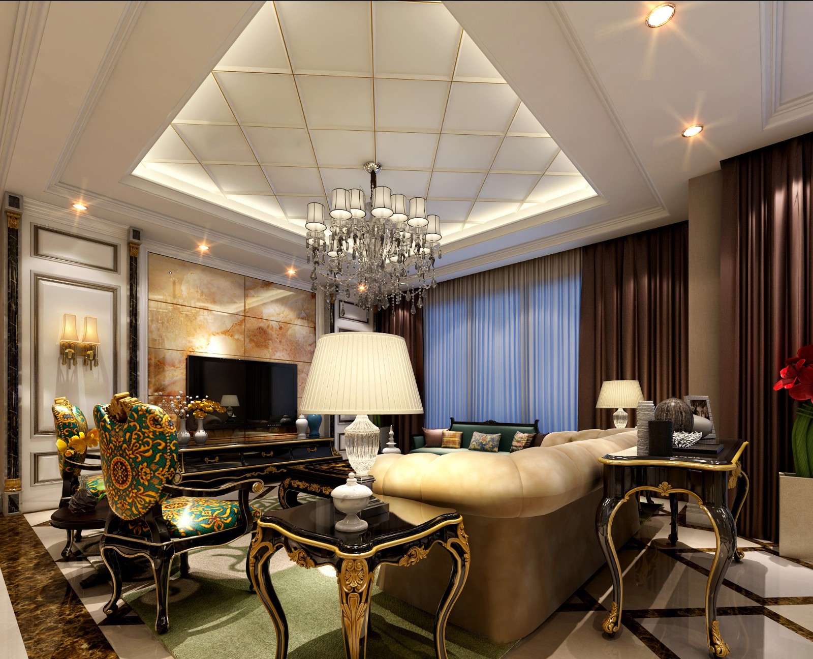 主卫采用双洗手盆设计,采用欧式吊灯、造型吊顶和大面积镜子,尽显奢华地板瓷砖的雪花图案仿佛是吊灯的投影。