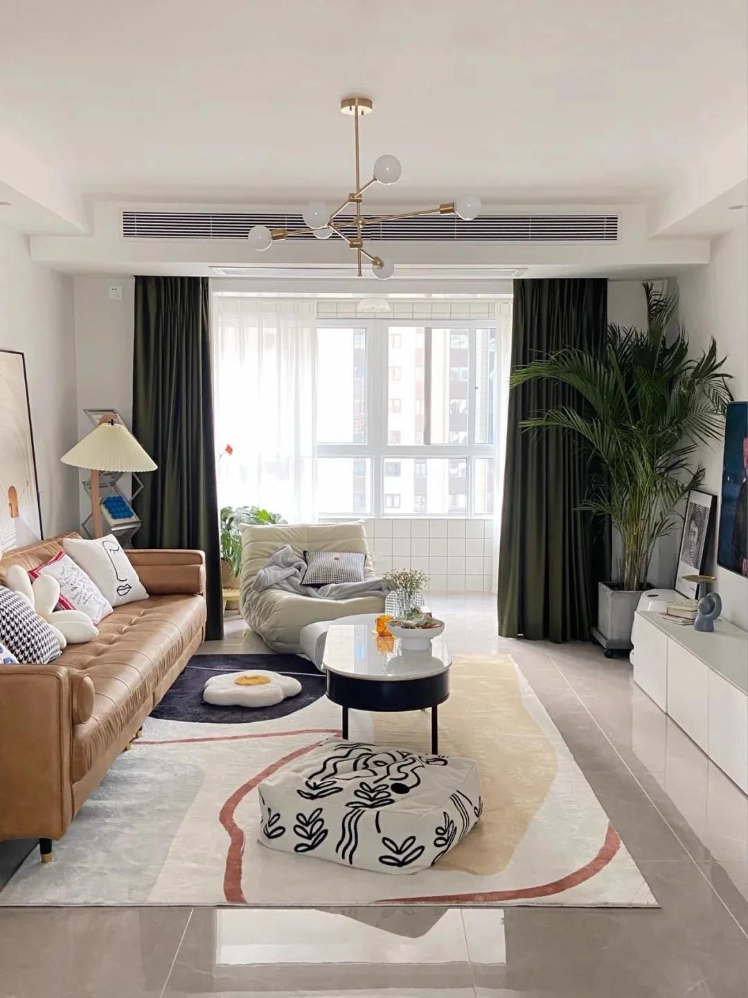 客厅做了简单的吊顶,装了中央空调,美观大气,打通了阳台,不仅增加了使用面积,视觉上也更显宽敞明亮,地面铺设灰色瓷砖,特别大方耐看耐脏,当然了,瓷砖本身是自带冰冷感的,有些朋友可能会觉得不温馨,但是只要铺上一张地毯,视觉温度立马就会提升不少,像屋主家这样,用一张抽象地毯搭配两个充满趣味性的坐垫,既增加了艺术感又增了舒适度。