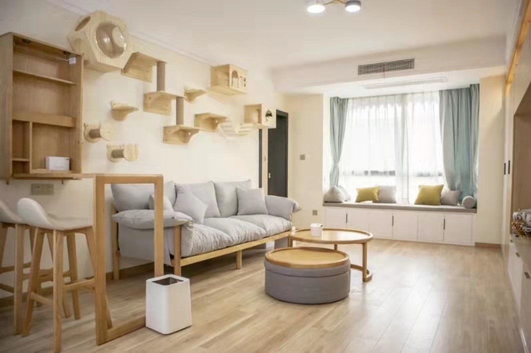 沙发背景墙安装了猫咪活动用的跳板和猫屋,养猫的朋友都知道,猫咪平时是喜欢攀爬的。