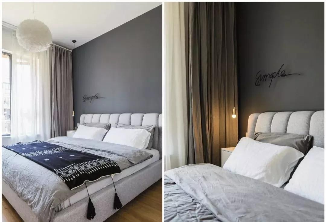 喜爱北欧和新西兰文化的夫妻两,主卧同样选择北欧+自然风,一面灰色主墙配四围白墙,高床软枕打造出舒适的居住感!