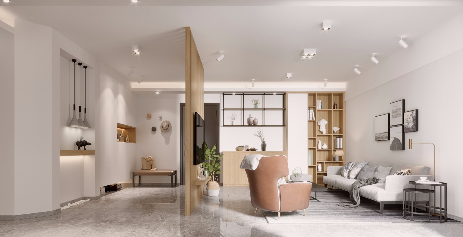 两房一厅,现代简约风格,业主是两年轻小夫妻,加一个读小学的孩子,对空间设计感和储物有要求。