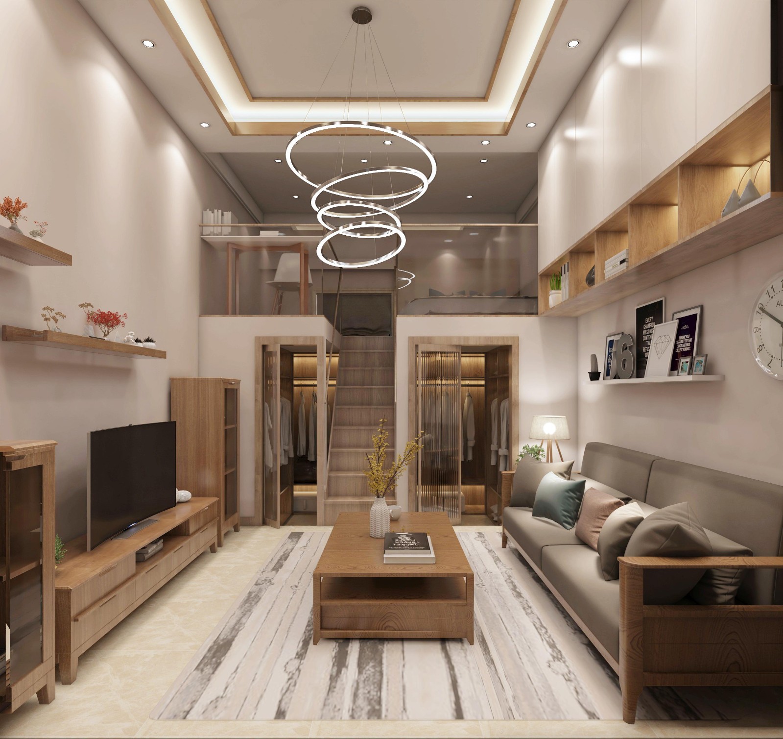 客厅做分层楼上当卧室 楼下做衣帽间 储物空间大大增加