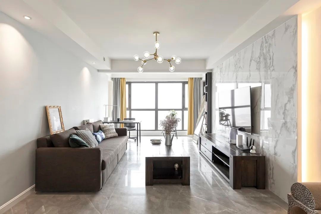 客厅通透敞亮,简洁的硬装设计,加上干净利落的软装,干净而舒适。简单的边吊顶设计,不仅拉伸了空间层次感,又不影响空间整体高度。阳台内包是个不错的选择,扩大客厅空间,采光也更直接。