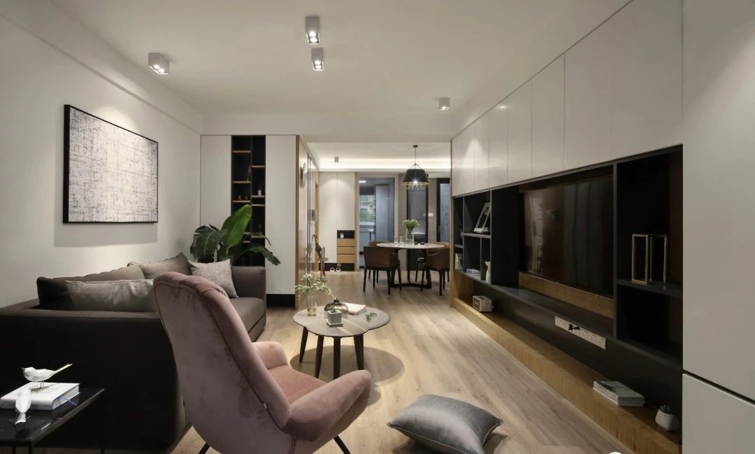 植物的绿、吊灯的金属色泽、单人沙发的烟粉,点缀其间装饰出恰如其分的生机和浪漫。烟粉色休闲单椅是女主的最爱,每天晚上抱着猫坐在这里看电视的时光简直不能太舒服。
