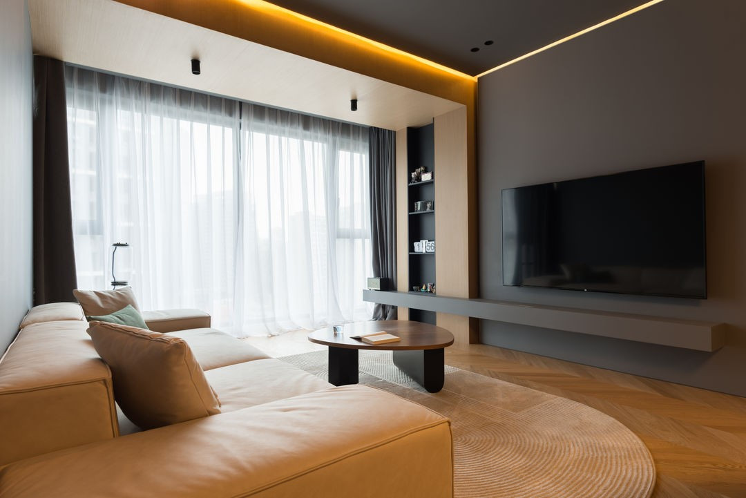 墙顶面大面积深灰色的情况下,整体采用了很柔和3000k色温,同时配合了整面落地窗,提升了空间通透感的同时也降低了深灰色带来的压抑感。整体空间并没有设计很多造型部分,仅仅做了最简单的色彩处理,由于有两个储物间的关系,客厅并没有设置很多储物功能,只是在电视墙左侧设置了展示区域,右侧配以巧妙隐藏的格栅储物柜,简单又功能性十足。