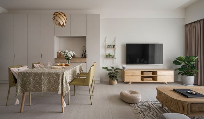 选择原木色家具让家的气质充满无限的温情,搭配藤编的茶几、圆弧的边几,彰显了两个主人对原始美的追求。再搭配北欧中常见的绿植,让家里充满着清新与自然,让回家就像在度假。