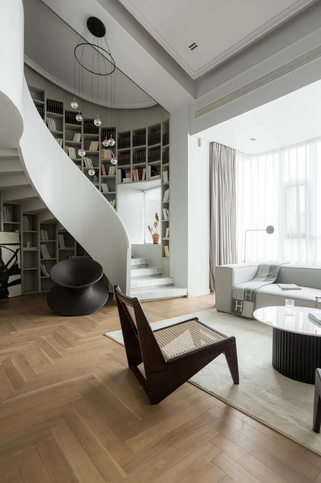 旋转楼梯的走势,设置了一面弧形书柜,让垂直动线更具实用性。