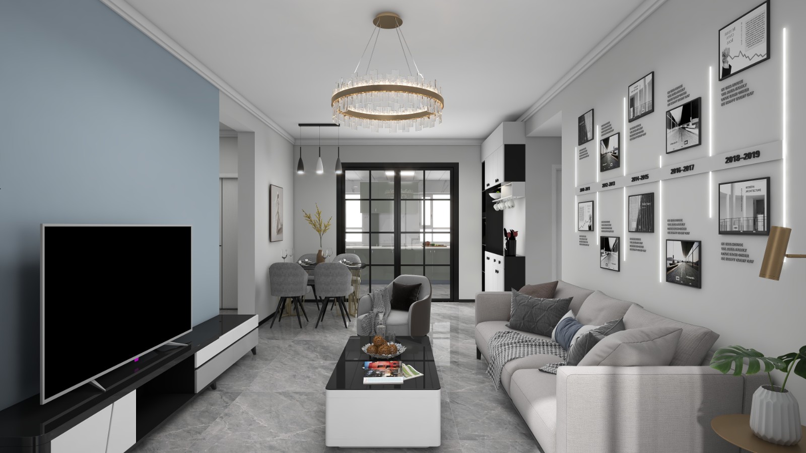餐客一体,主体黑白灰加上调色的背景墙,简约大气