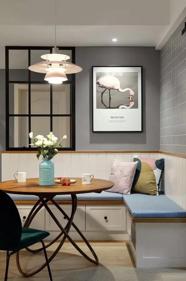 在入户门对着的空间,设计师做了一个L形的卡座餐厅,对于小户型来说,卡座是非常合适的。它自带收纳又能代替餐椅,黑框玻璃让这个餐厅看起来更加时尚。