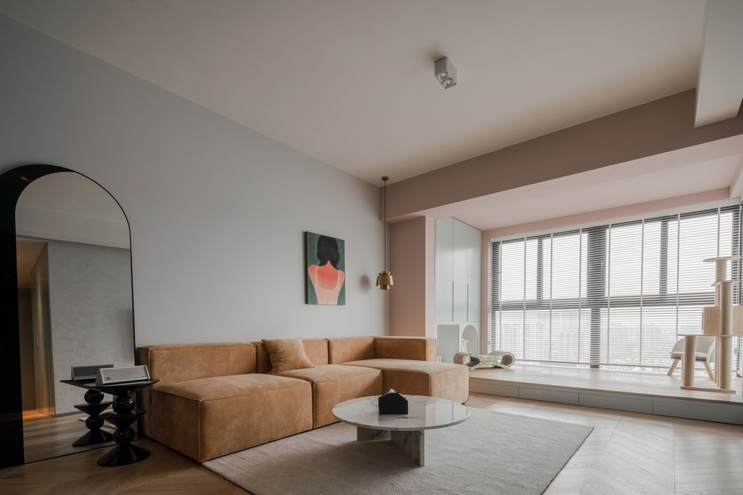 增加空间材质的层次感,地面铺了业主喜欢的人字拼地板,低饱和度的色彩映衬原木温润的质感。