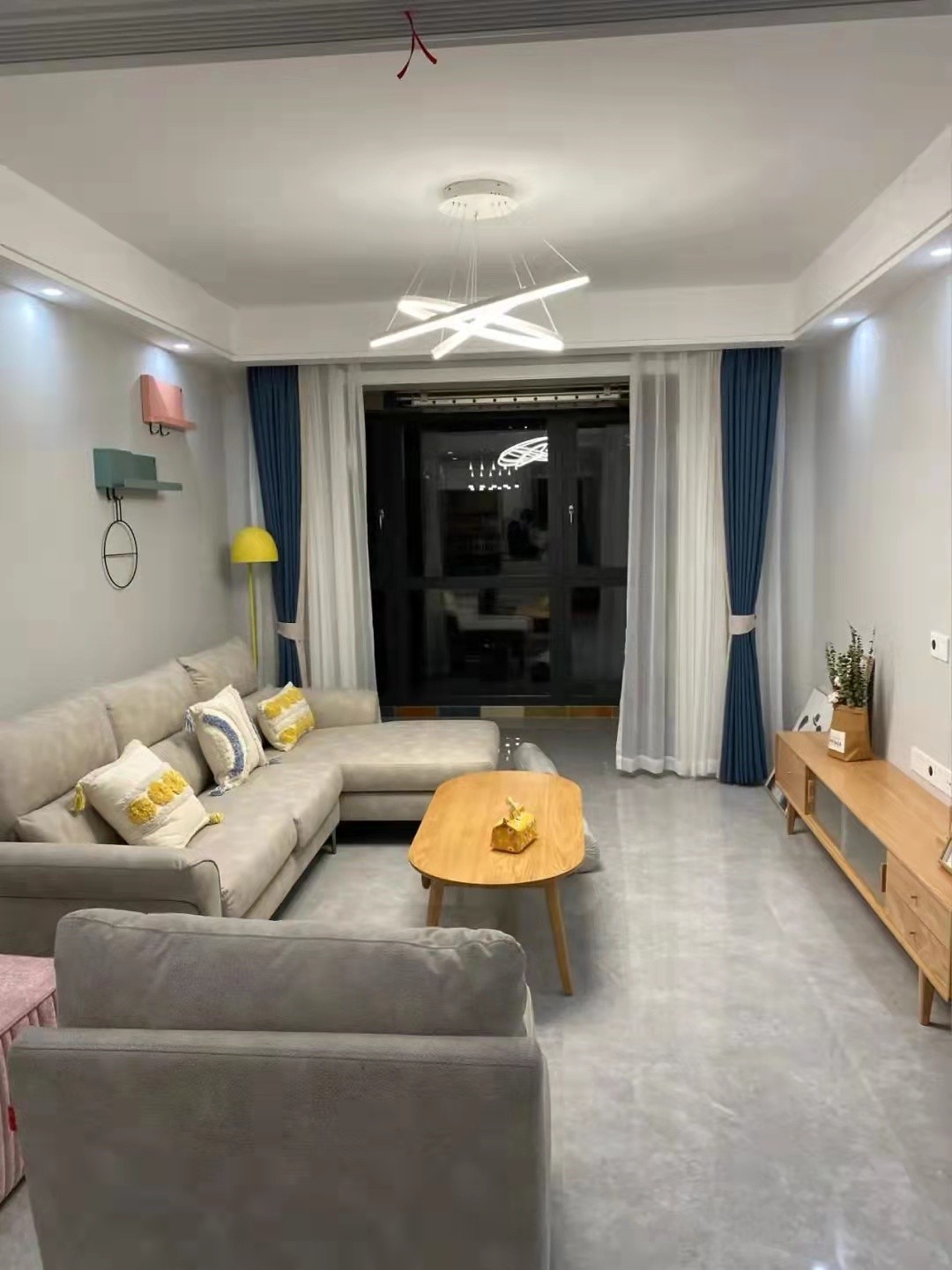 客厅布置了“L”字型灰色布艺沙发,方便坐着的同时,也方便偶尔躺着,真心实用。墙上安装了蓝色与粉色的隔板,右边放着的落地灯,晚上可以增加二次照明,觉得还不错哈,特别舒适