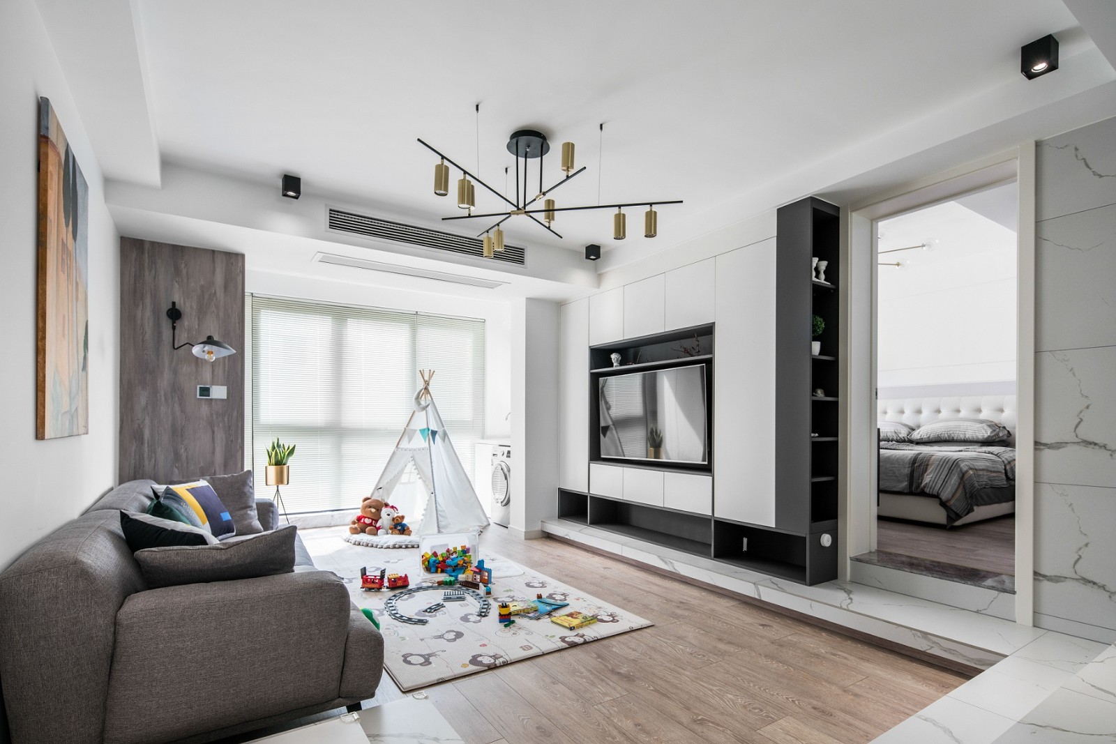 客厅以暖灰色为主,辅以纯白及纯黑色亚光木制定制墙柜,用抱枕,挂画,灯饰小面积做了彩色装饰。