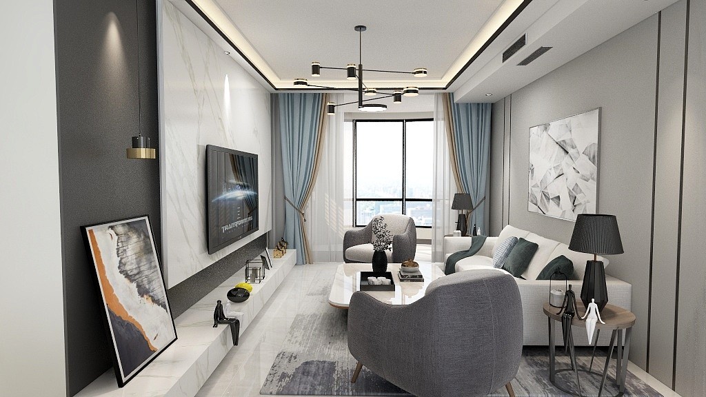 客厅整体采用大理石电视机背景墙,视觉上整体看起来干净整洁