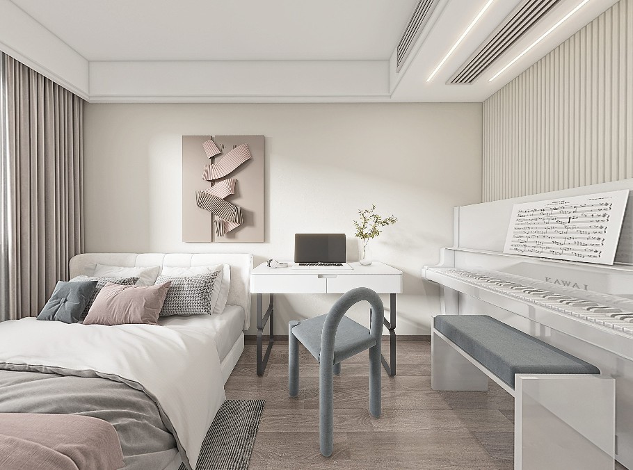 浅灰色在暖暖的灯光映衬下有了温度,亚麻布艺沙发和白色窗纱显得整个空间十分静谧。