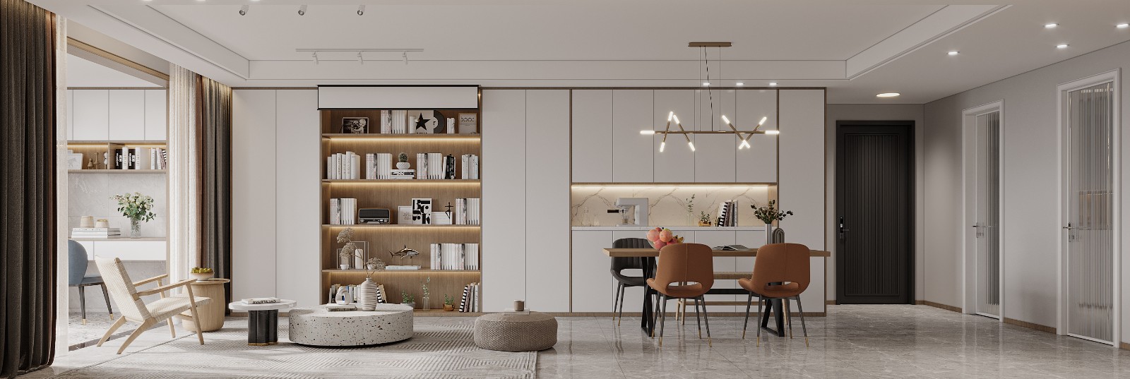 简洁的电视墙以朴素的设计基调,富有艺术感的灯光的设计,也带来了一种简洁优雅的舒适与大气感。