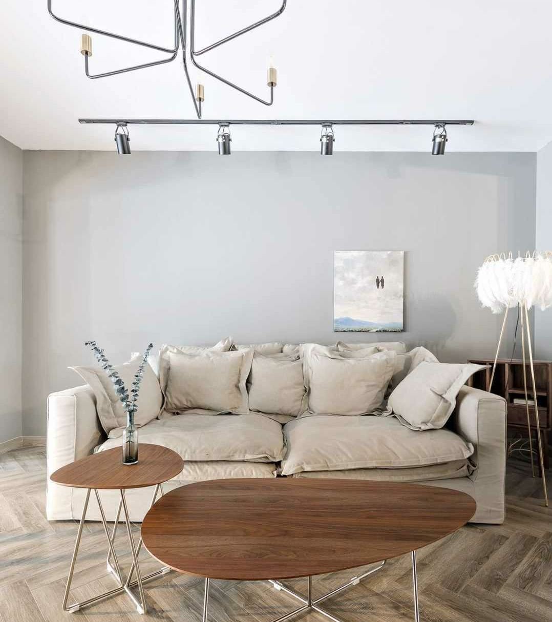 不论是色彩的搭配、家具的造型都以现代简约沉稳为基础,偶尔的跳脱,营造出无压、放松的空间感受。客厅是无主灯的布置,只有射灯的照明突显简约大方的氛围。