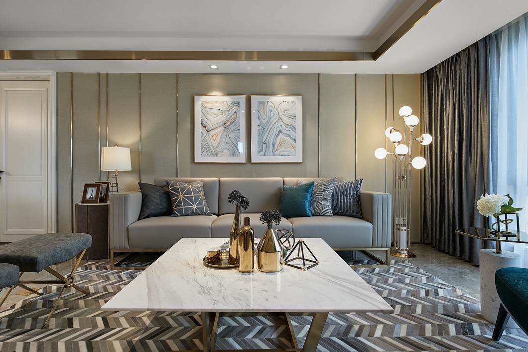 整体色调多采用这种暖灰色。吊顶以及墙面和家具采用金属质感的。