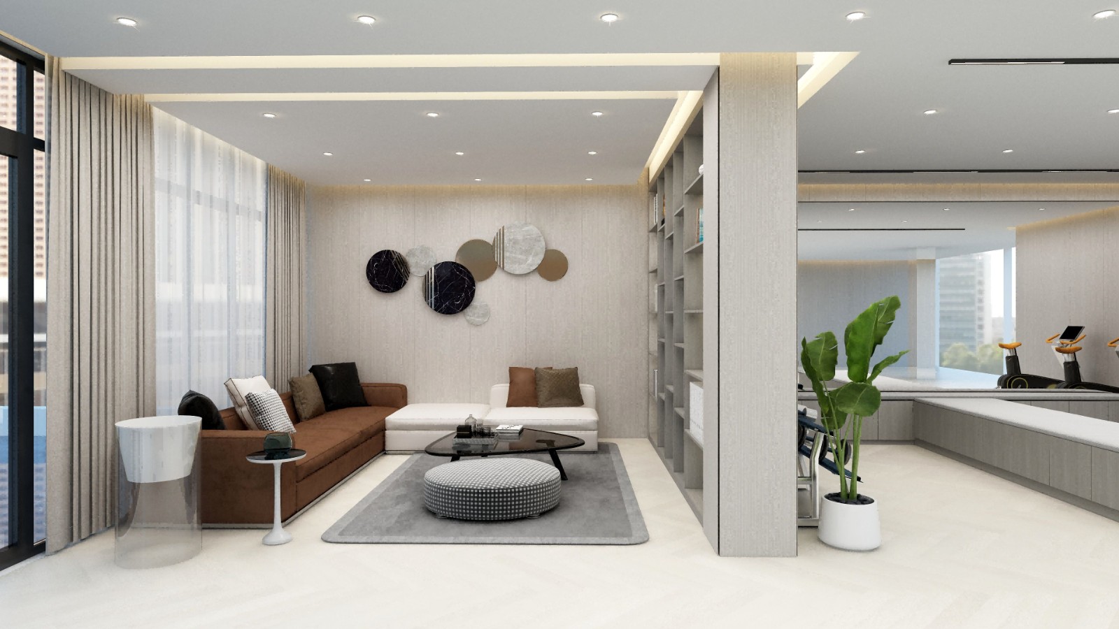 对于偏长的户型,最是需要一个隔断,双面开放的隔断柜在不·损失·空间·连贯性·的·同时·将空间·分割的恰到好处·,跑步机旁原有·两根承重柱,使用镜面包裹使立柱在空间·中的异物感变弱,新增的镜子面也可用作检查自身修行成果的好助手。