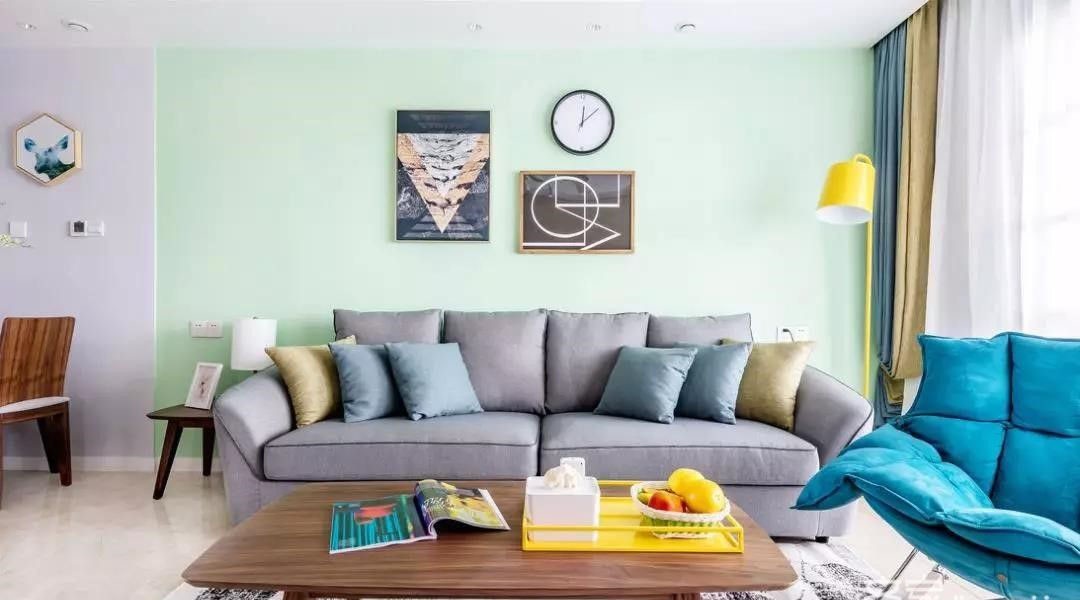 沙发背景墙一层青草绿,十分清爽舒适。灰色布艺沙发柔软舒适,同时起到了很好的中和作用。装饰画、黄色落地台灯点缀空间,丰富空间内涵。